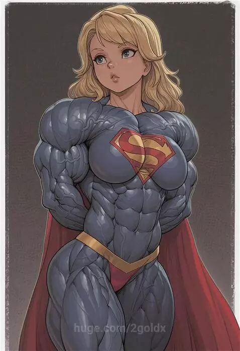 Supergirl muscular, posing with smile, flexing biceps, walks