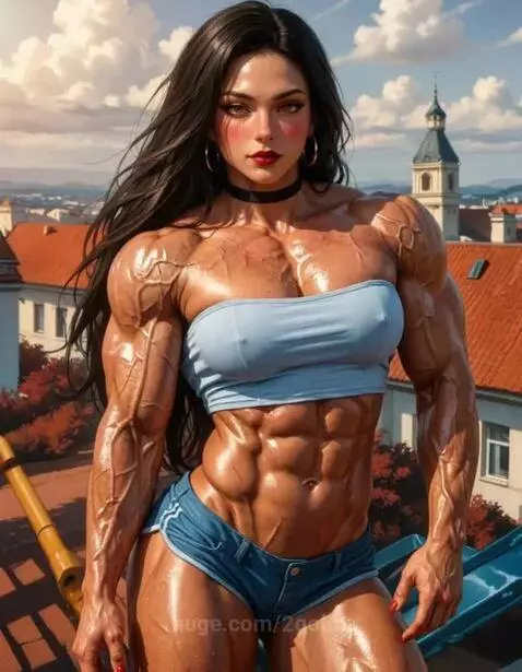 muscular bodybuilder, posing with smile, flexing biceps, walks, roofs