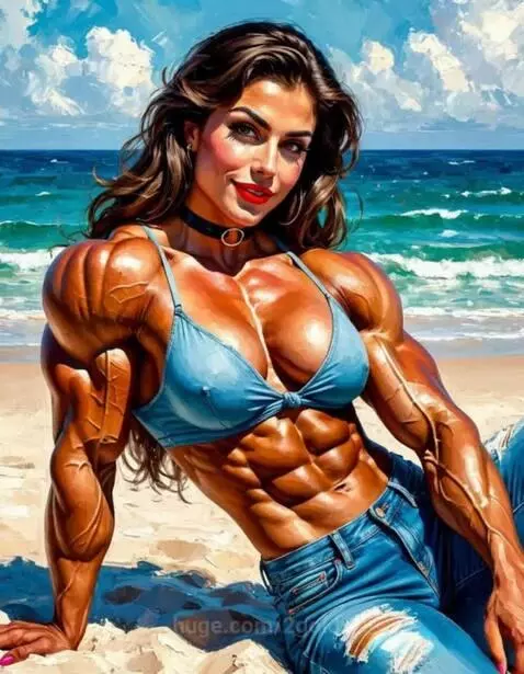 Bodybuilder female flexing muscles, massive muscles, deep breathing , beach,