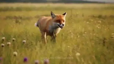 A wild red fox runs through the fields