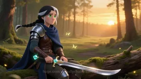 PixVerse v5 Prompt: A short, seamless looping animation, 4 seconds, cinemagraph style, calm atmosphere. The warrior Valeriya sits on a fallen mossy log at the edge of a tranquil forest clearing during sunset. She has a pale, thoughtful face, her piercing green eyes reflecting the fading light, the single silver streak in her dark braid catching the warm glow. She wears her weathered leather and steel armor, her midnight blue cloak pooled around her. Her iconic curved longsword rests across her lap, its crystal pommel emitting a soft, rhythmic pulse of light, in tune with her breathing. The only subtle movements in the loop are: 1) The slow, steady rise and fall of her shoulders as she breathes. 2) The gentle, synchronized pulse of the crystal in her sword. 3) A few strands of her hair and the edge of her cloak stirring in an imperceptible, constant breeze. 4) The slow drift of a single firefly moving in a small, lazy circle near her. The background is a beautifully painted forest with golden hour light filtering through leaves (static). Seamless loop, perfect for a GIF, meditative, peaceful, Blender animation, style reminiscent of Studio Ghibli backgrounds with realistic character detail.cinematic. full hd. high resolution.