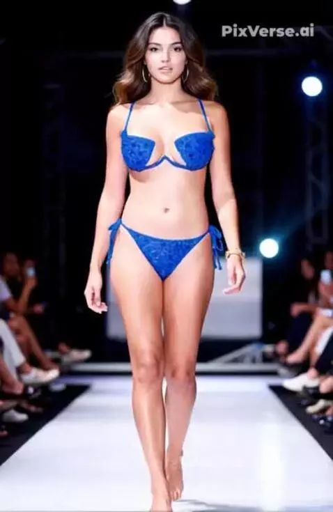 With a beautiful gait, the girl demonstrates new clothes, showing them from all sides while walking in a circular motion.