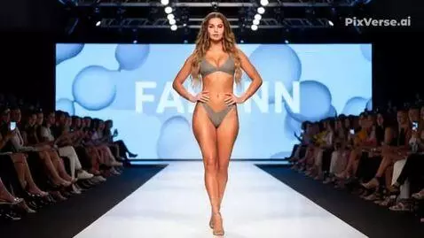 A beautiful fashion designer shows off her clothes to the audience from all sides with smooth circular movements