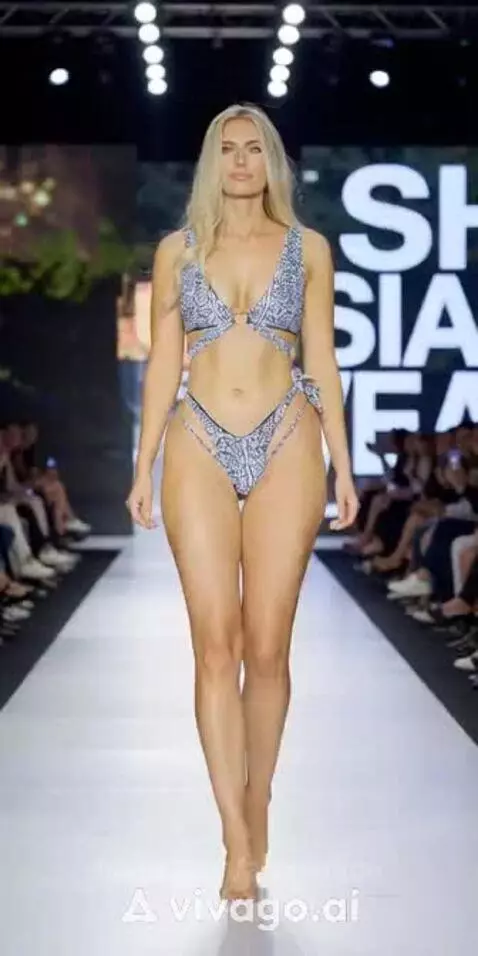 A beautiful fashion designer shows off her fashionable bikini