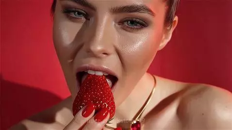 Close-up of an adult woman with dramatic makeup sensually licking a large ripe strawberry, wearing a gold necklace with a red gem.