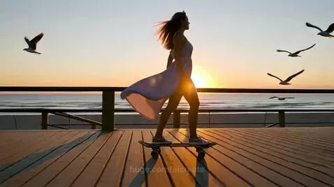 woman on a one wheeled skateboard gliding down a beachside boardwalk as the sun is setting