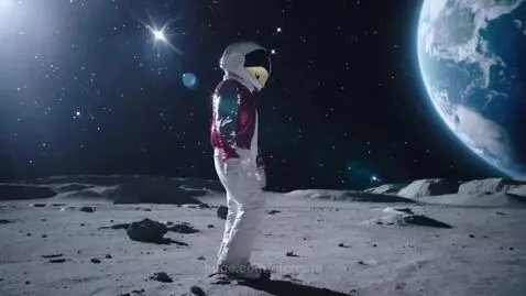 An astronaut with silver sequin gloves and a red sequin jacket does the popular dance move "the moonwalk" on the moon