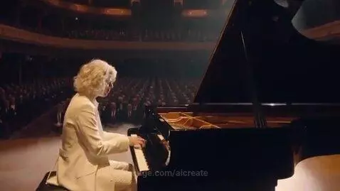 A ethereal pianist plays classical music in an auditorium full of people listening in awe