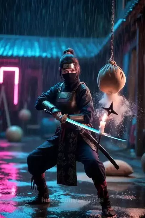 Beautiful anthropomorphic black fur vixen assassin, green eyes, tight black futuristic armor with glowing cyan neon lines, holding rifle. Mid-jump across rainy cyberpunk rooftop at night, neon lights reflecting on wet fur, dramatic low angle, highly detailed, 8k"