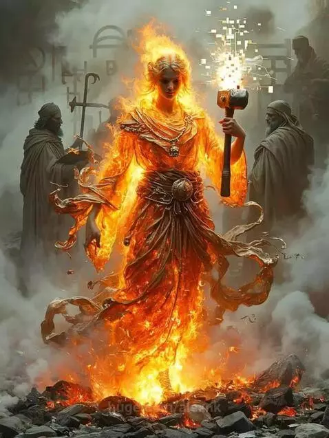 Brighid the goddess of fire walks forward brandishing her arms and hammer