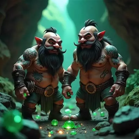 Funny dwarfs rejoice at emeralds and sing a song about treasures