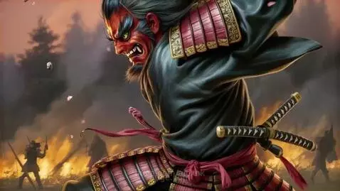 Samurai waves his sword under a battle cry