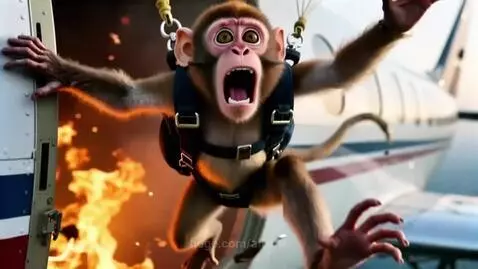 LTX-2 Pro Prompt: A monkey stands in the open hatch of a burning and falling plane. She's wearing a parachute. The paws hold onto the edges of the opening. The monkey's eyes are big with horror, she screams loudly, turns her head, shakes, She looks at the fire with horror and decides to jump out of the plane. Everything is in close-up. The monkey falls with its paws outstretched. She screams, her muzzle shakes from the flow of air, and her paws shake in different directions.