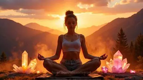*"A breathtaking sunset over the mountains, where a young woman meditates peacefully. Large, translucent rainbow crystals float weightlessly around her, refracting light into dazzling patterns. The air shimmers with golden and pink cosmic dust. The scene is warm, magical, and hyper-detailed, with a medium-slow camera pan for a calming effect. 8K resolution, photorealistic, cinematic lighting."* vertical video