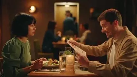 sora 2 Prompt: A woman on a first date at a trendy restaurant tries to maintain composure while her digestive system rebels. Her date obliviously suggests ordering the 'extra spicy challenge' for dessert. Close-up on her horrified expression as she spots the single bathroom with a growing line. Comedy of errors, physical humor