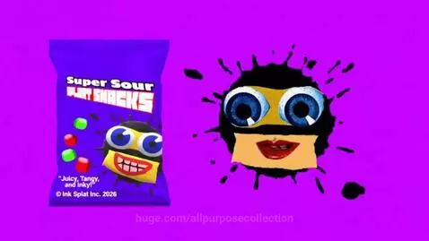 a arabic and english uae commercial about a product named "Super Sour Splaat Snacks" featuring a talking cardboard-looking face with realistic eyes and a realistic mouth with purple-ish teeth on an ink splat in a plain pink background