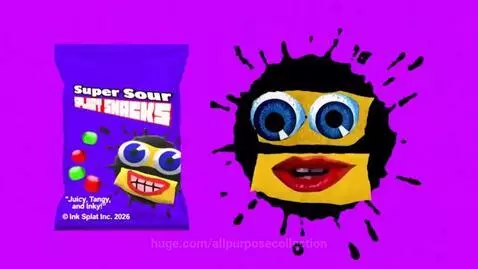 a super duper ytp video commercial about a product named "Super Sour Splaat Snacks" featuring a talking cardboard-looking face with realistic eyes and a realistic mouth with purple-ish teeth on an ink splat in a plain pink background