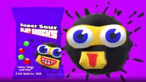 sora 2 Prompt: a mlg roblox crazy commercial about a product named "Super Sour Splaat Snacks" featuring a talking cardboard-looking face with realistic floating eyes and a realistic mouth with purple-ish teeth on an ink splat in a plain indigo background. the product on the right is a still image with no animation