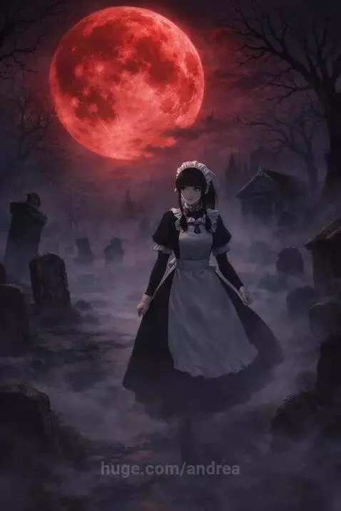 Молодая девушка-горничная в традиционной черно-белой форме с белым фартуком и чепцом медленно и нерешительно идет по старому, заброшенному, туманному кладбищу поздней ночью.