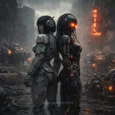 Description: A lone warrior in futuristic armor stands back-to-back with a damaged gynoid in a desolate, rubble-filled street. They are surrounded by destroyed military robots and abandoned vehicles. Mood of uneasy alliance or last stand. Fog, muted color palette with accents of neon light from a broken sign. Highly detailed character design, apocalyptic scenery, hyperrealistic.