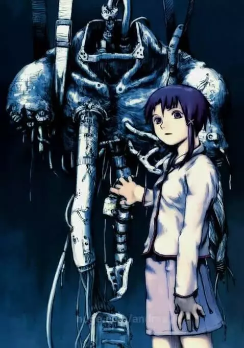 a girl stands next to the cyborg's remains and examines them
