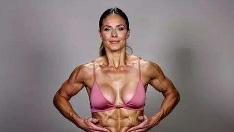 muscular woman bodybuilder, flexing abs, breathing animation, huge muscles,