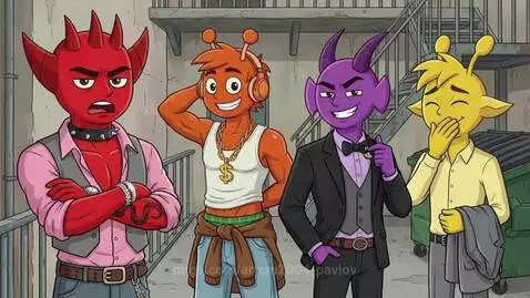 Seedance 1.5 Pro Prompt: Four characters bob their heads to the music. The red character crosses his arms and cheekily says "Sweet Brown Shuga," then looks at the orange, purple, and yellow characters. Lights of red, orange, yellow, and purple are faintly visible in the background. At the bottom of the screen, the words "Sweet," "Brown," and "Shuga" appear one after another as the red character speaks. The song "Brown Shuga" by rapper Sir Mix-a-Lot appears in this video.