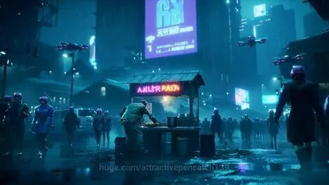 Kling 2.5 Turbo (pro) Prompt: A hyper-detailed, photorealistic slice of life in NeuroCity, 2099. Ground-level view on a rain-drenched street at night. The air is thick with a neon haze—vibrant blues, purples, and cyans—reflecting off wet asphalt and oily puddles. Towering, decaying megastructures loom overhead, wrapped in flickering holographic ads in Mandarin and corporate logos. Crowds of diverse citizens in practical, weathered smart-fabrics and subtle cybernetics (glowing ocular implants, data-jack ports) move with purpose. Autonomous delivery drones weave silently through the air, casting dynamic shadows. In the foreground, a small, steamy noodle stall with a flickering 'RAMEN' sign is tended by an elderly human with a worn mechanical arm. Every raindrop is crisp, every texture—from the grimy concrete to the fabric of a passing coat—is rendered in ultra-high fidelity. The atmosphere is humid, melancholic, yet teeming with quiet life. Cinematic composition with a shallow depth of field, shot on a simulated ARRI Alexa 65. Color grading: teal and orange base with neon magenta accents. Volumetric lighting and realistic, ray-traced reflections in every puddle. No action, no drama—pure, immersive cyberpunk mundanity. Focus on the intricate details of everyday existence in a world saturated with technology.