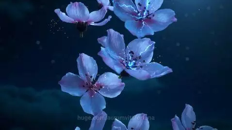 Falling sakura petals with electric currents: soft pink petals slowly twirl and descend in a dark sky, bright blue electricity and sparks flow across each one. Slow motion, cinematic, highly detailed, 5 seconds.