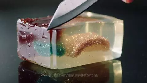 Ultra-detailed macro shot of colorful crystal soap being sliced slowly with a sharp knife — shimmering particles, smooth satisfying cuts, soft lighting, gentle reflections, cinematic slow motion, hyperrealistic texture, 4K ultra HD