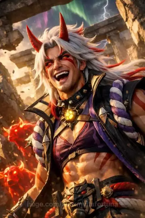Kling 2.5 Turbo (pro) Prompt: Create a cinematic 10-second realistic render of Arataki Itto, a tall and imposing young oni man from Inazuma with long wild white hair streaked with pale red tips cascading down his back, two prominent red horns on his forehead, sharp fangs, diamond-shaped pupils in eyes fading from red to yellow, and red war paint markings across his face, arms, and body, dressed in his signature spiked black sleeveless coat over a cropped purple top, thick purple-white ropes on shoulders, massive black belt with oni-mask buckle, gray pants tied with red ropes, and Geo Vision on a spiked choker. He strides powerfully through ancient sunlit Inazuma shrine ruins overgrown with vines at twilight under shimmering aurora-like storm lights with distant lightning flashes, summoning glowing red Ushi bulls and surging Geo crystals that erupt into massive spiked stone pillars crashing around him as he laughs boisterously with a cocky grin. Dynamic camera glides in a slow orbiting close-up shot from low angle, hyper-realistic horn textures and fabric folds, hair swaying in a warm mountain breeze, volumetric mist and god rays through cracked stone torii gates, subtle Geo ripple effects on his silhouette. Ultra-detailed face with boisterous bravado, sharp 8K resolution, epic atmosphere blending unyielding pride and oni fury.