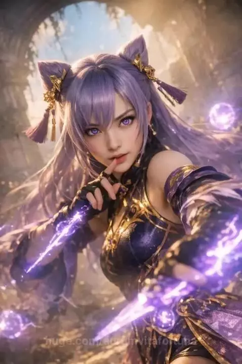 Kling 2.5 Turbo (pro) Prompt: Create a cinematic 10-second realistic render of Keqing, a striking young woman from Liyue with fair skin, amethyst eyes featuring oval-shaped pupils and diamond pupils, waist-length lavender hair fading to silver-purple tips tied in two cat-ear-like buns adorned with golden hairpins and tassels, dressed in an elegant sleeveless dark blue qipao-style dress with intricate gold filigree patterns, violet-gold gradient overcoat with feather plumes at the hem, detached purple sleeves, thigh-high stockings with gold accents, and an Electro Vision at her waist. She dashes gracefully through ancient sunlit Liyue temple ruins overgrown with vines at twilight under shimmering aurora-like lights, summoning flickering Lightning Stilettos that she blinks between, unleashing rapid Electro slashes and thunderclap strikes that bloom into crackling plasma orbs dancing around her as she whispers strategies intently, expression sharp yet resolute. Dynamic camera glides in a slow orbiting close-up shot from low angle, hyper-realistic hair tassel textures and fabric folds, hair swaying in a warm mountain breeze, volumetric mist and god rays through cracked stone arches, subtle Electro ripple effects on her silhouette. Ultra-detailed face with predatory poise, sharp 8K resolution, mystical atmosphere blending ambition and forbidden knowledge.