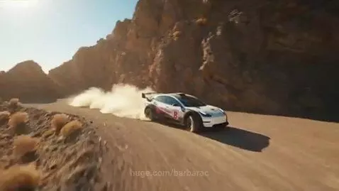 sora 2 Prompt: Drone shot chasing a rally car drifting around a sharp corner on a dirt road, dust kicking up, intense sunlight, cinematic motion blur, high action, with a beautiful egyptian princess in the drivers seat giving directions to the Tesla car as it races