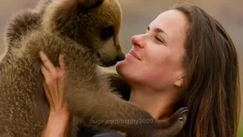 Медвежонок обнимает девушку а она поднимает голову и смотрит ему в глаза
