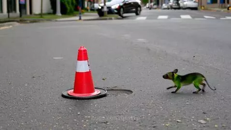 The green mouse jumps onto the traffic cone, while a car rushes by and almost knocks them over.