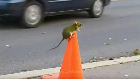 The green mouse jumps onto the traffic cone, while a car rushes by and almost knocks them over.