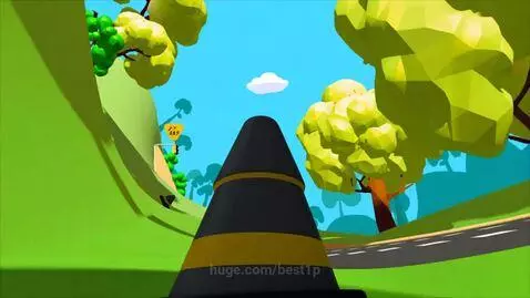The green mouse jumps onto the traffic cone, while a car rushes by and almost knocks them over.
