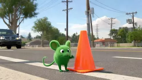 The green mouse jumps onto the traffic cone, while a car rushes by and almost knocks them over.