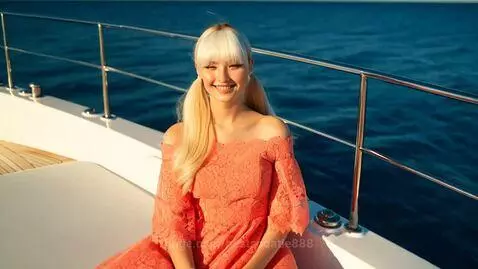 MiniMax Director Prompt: молодая женщина с длинными светлыми волосами, собранными в два хвостика, челка, белоснежная улыбка, одета в кружевное платье персикового цвета с открытыми плечами, сидит на яхте с белыми перилами на фоне голубого моря и неба в солнечный день, сфокусированный снимок