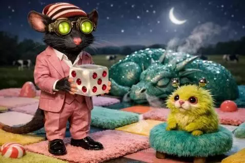 otter stands on stool and watches rat. Rat rolls one dice to dragon. Dragon yawns and dices rolls into the dragon's mouth.