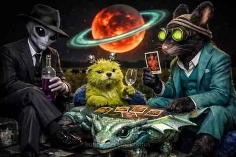 The rat puts down the card and picks up another card. The alien pours purple liquid into the otter's wineglass. Saturn rotates.