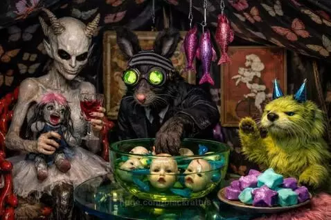 The woman pours a little wine in the doll's mouth, The rat removes a doll head from the bowl, The otter stands and grabs a hanging pink tuna.