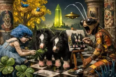 The ponies eat the grass slowly munching. The painter paints the ponies on the canvas. The girl looks up to see the rotating flying saucer.