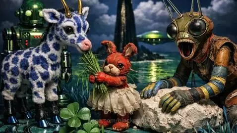A leather puppet with mantis head molds a giraffe from clay as a bunny feeds a baby giraffe. A robot witnesses and a flying saucer hovers around an obelisk.