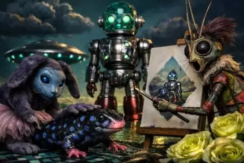 The robot steps forward and picks up the salamander. The robot walks to the flying saucer with the salamander. The rabbit and puppet panic.