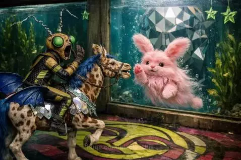 The horse prances as the rider shakes the reins. The rabbit swims behind the glass and waves slowly at the rider. The seaweed ebbs gently.
