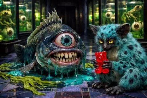 The lemur takes a bite of the gummy bear as the fish blinks and watches. The lemur feeds the gummy bear to the fish. Ooze slowly drips form the fish.