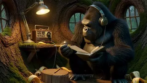 Un gorille faisant ses écrivant sur un cahier écoutant de la musique et il est grognon