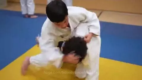 two boys in judogi,grappling and roll over each other