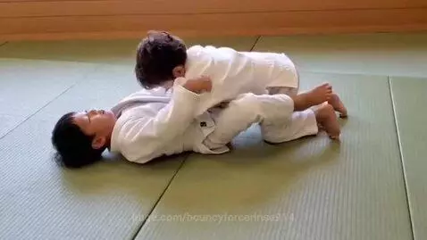 two boys at six years,wearing white judo jackets,white obis and cropped white judo pants,one boy lay on his back,the other boy lay on top of his opponent grapevining thier legs with his own